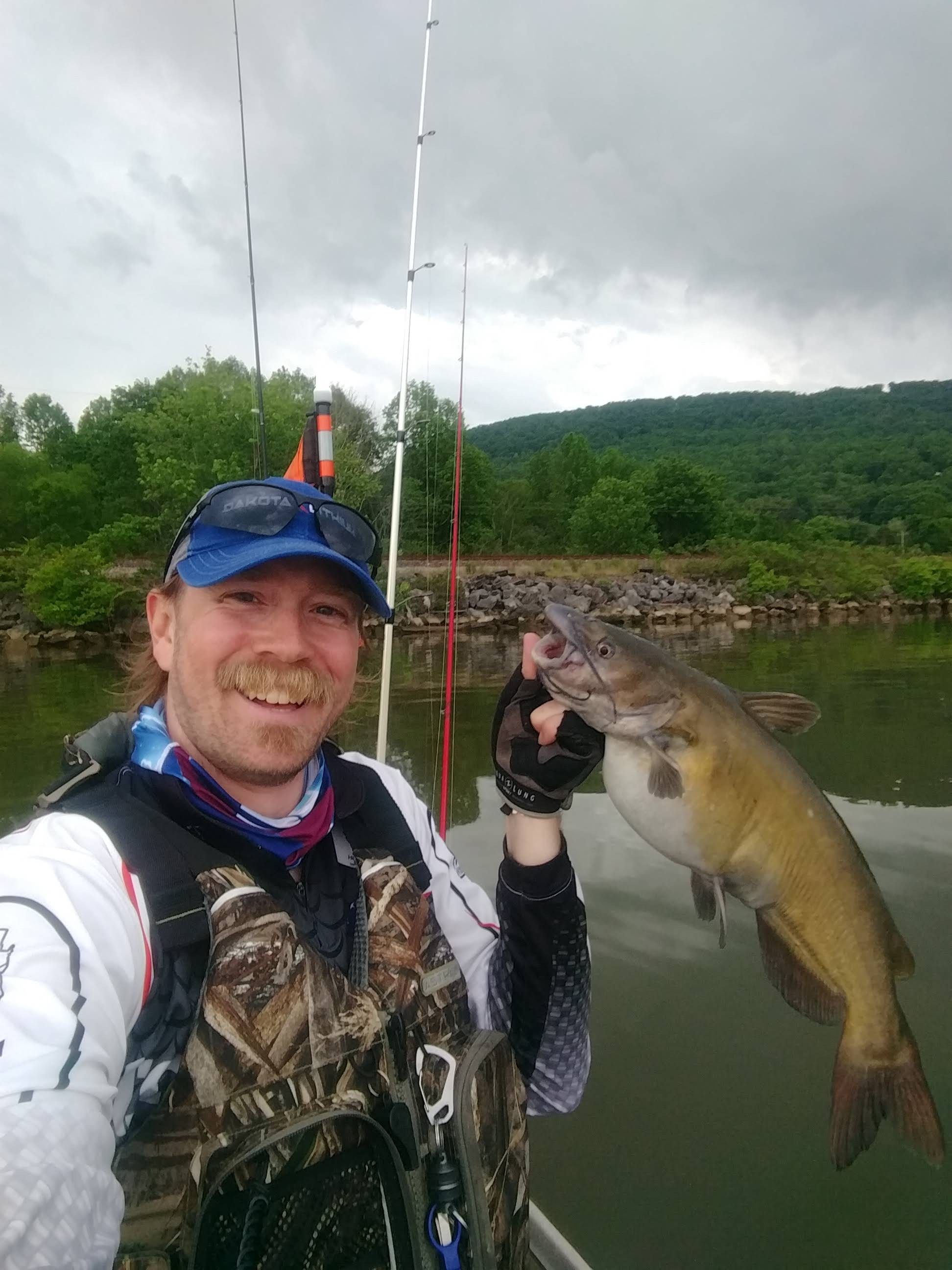 I noticed the birds had started diving again so I pedaled back out, switched back to the jerkbait, and quickly put another 14.25” on my board. That was four fish. One more and I had my limit. I worked the jerkbait around there a bit more but the school must have moved on so I continued along the riprap heading toward the flat. The only thing I caught there was a nice channel cat. Always my luck, I catch great eater fish in the middle of tourneys when I can’t take the time, and don’t have a spot to keep them. Oh well.