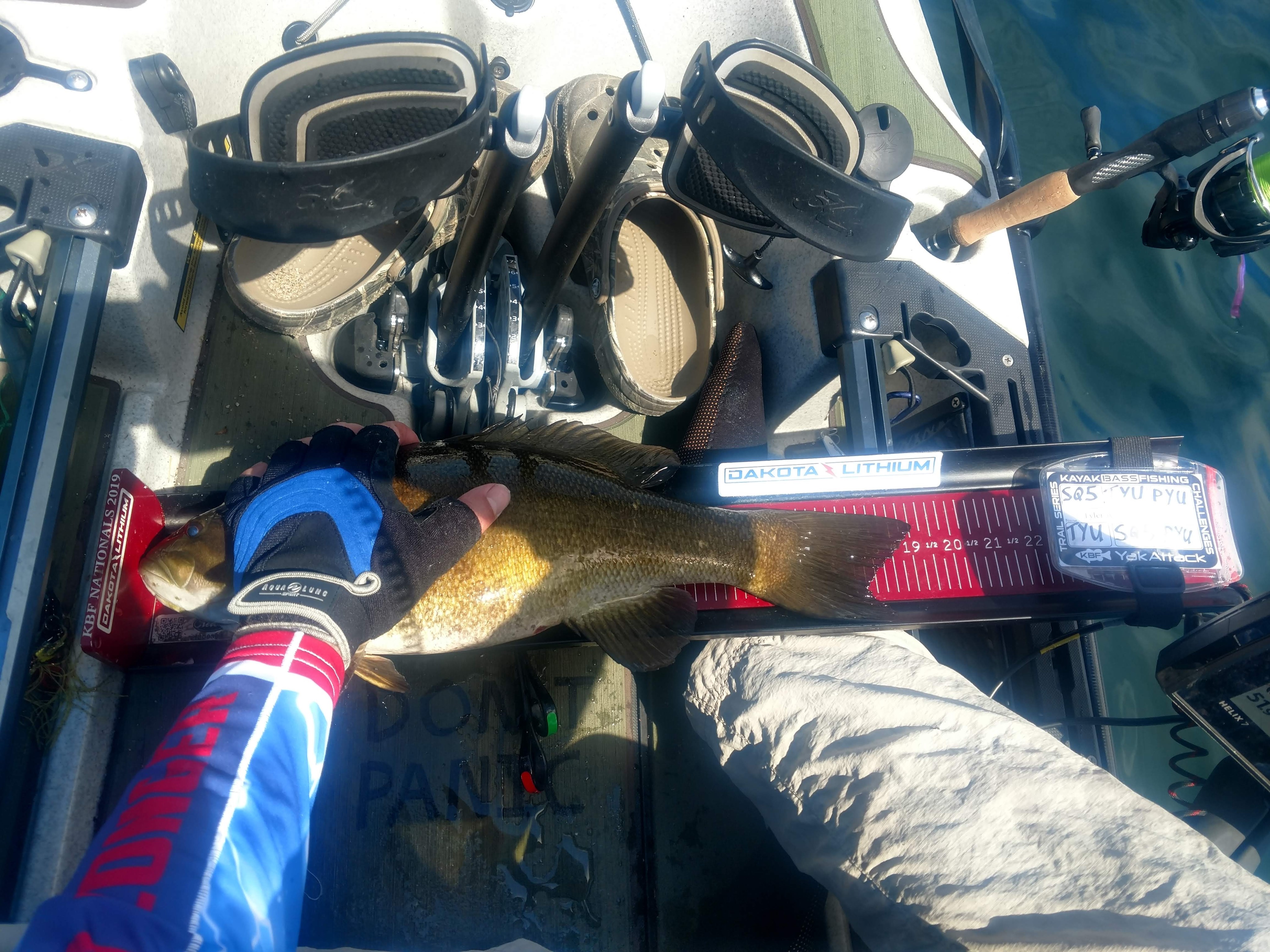 It was a toad! Finally the class of fish I was looking for, a 19-inch smallmouth. I quickly got it on the board, got my photos and tossed it back without even thinking about a selfie. I knew there was a chance for big bass on the hour and I wanted to get it uploaded as quickly as possible. I also wanted to get my bait right back down there since smallmouth often school up in size class. There was a chance there was a few more giants down there and I wanted to see if i could find them. I stayed there instead of moving on to the second pile but I never got another bite. It was 1:50 and I needed to get back!