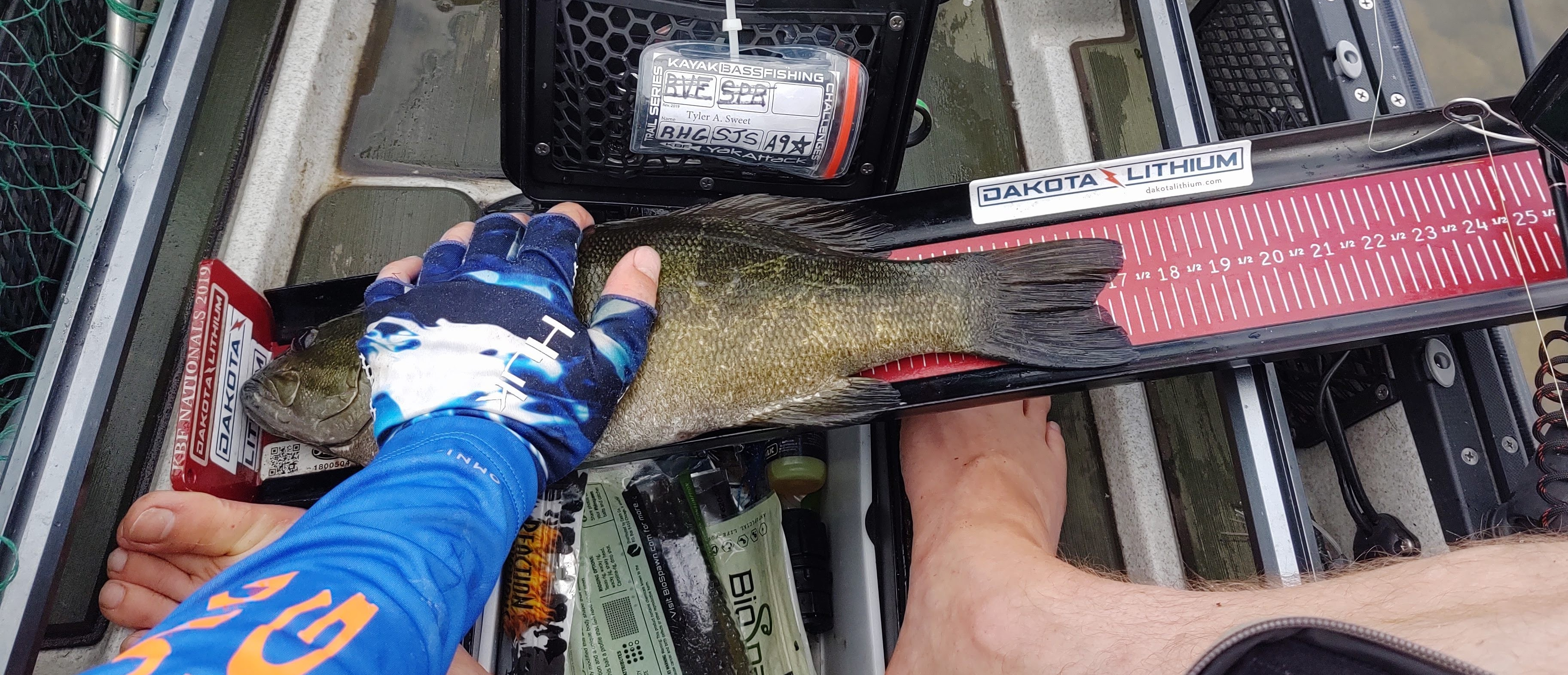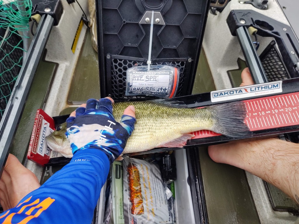 I moved on to the next dock and worked my way from the shallow out. Under the second section of dock I skipped my bait up under there and pulled out a nice 14 inch largemouth. A fun fish, but not a cull. I got out to the end and there was a boat along the face of the dock but it didn’t produce anything. When I got around to the other side, there was a nice opening between two floats I could cast back into. I skipped my bait way back in there and right on cue, a 17.75 inch smallmouth took it. I had to be careful with this one. There was a pole anchor to the dock and she kept swimming for it. I reached down and pulled my reverse cable and pedaled myself away from the dock into open water where I could fight her more freely. When I finally put her in the net, she was barely hooked by the skin of her upper lip. Call it luck or call it fate (I like to believe there’s a layer of skill in there), but that little bit of skin enabled me to cull that last 14.75 and had me sitting pretty with 85.75 inches. Little did I know (because I wasn’t checking the leaderboard for this event) that I was currently sitting in first place. There was still just over an hour left of fishing, so anything could happen.