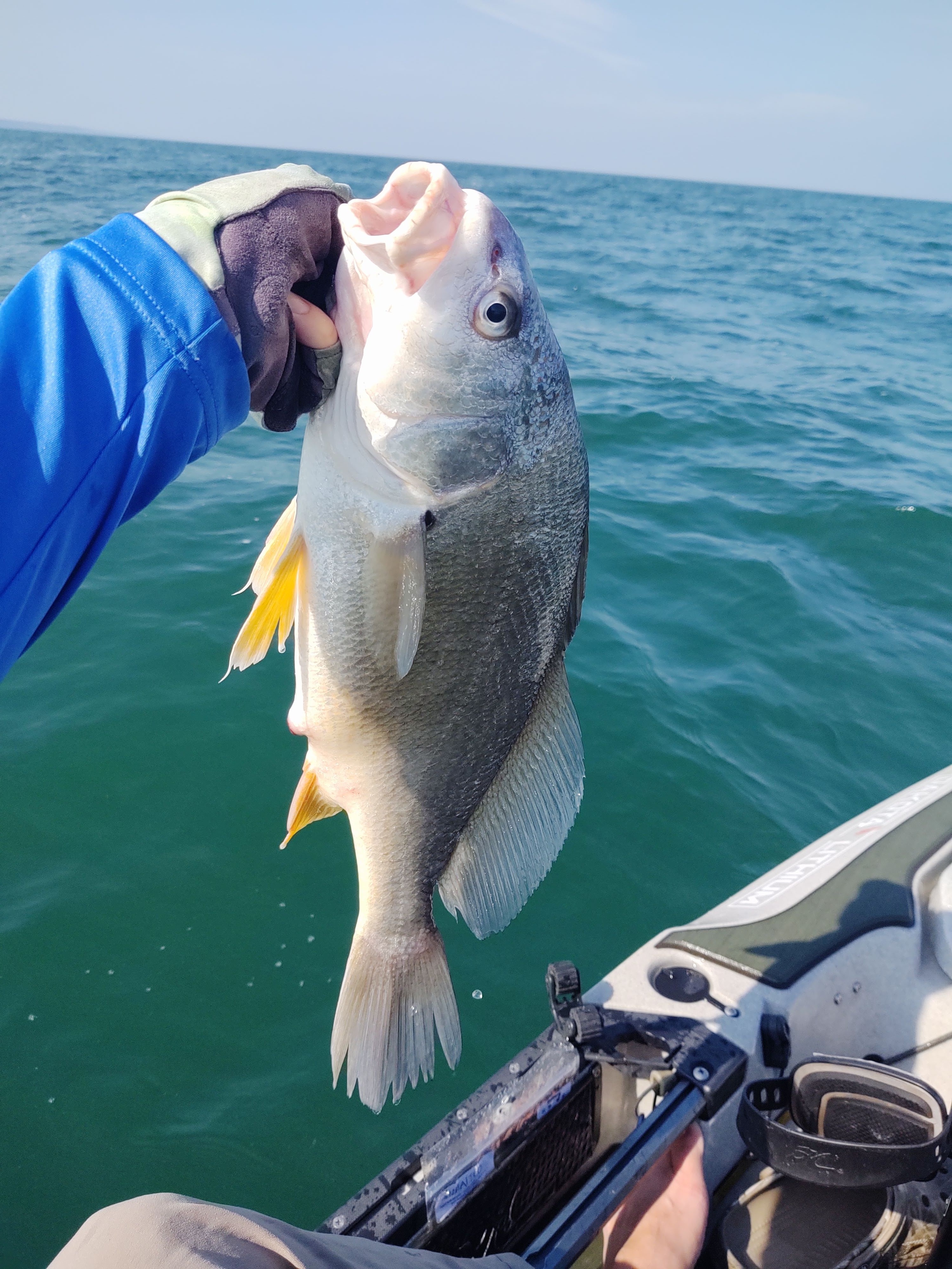 I continued to run that pattern over gravel bars from 25-30 feet deep. I landed another drum and a whole bunch of rock bass. I just didn’t know where the smallies were. When fishing rock on Lake Erie, you can catch drum, rock bass, smallmouth, and walleye all on the same structure. I just didn’t know if the smallmouth were there and wanted a different presentation, just weren’t feeding, or if I needed a new kind of structure all together. It was getting frustrating. On top of that, I was starting to get pretty seasick. The wind and waves were not that bad, but there was a steady swell on the water. Some were as big as 4-5 feet. Nothing dangerous as they were broad crested and would just pick the kayak up and bring it back down. But that swell, combined with the heat and sun was getting to me. I rarely get motion sickness. I think if the weather had been cloudy and cooler I would have been fine. Conversely if the lake had been flat calm with the sun and heat I would have been fine. But that combo got to me and I had to get off the water.