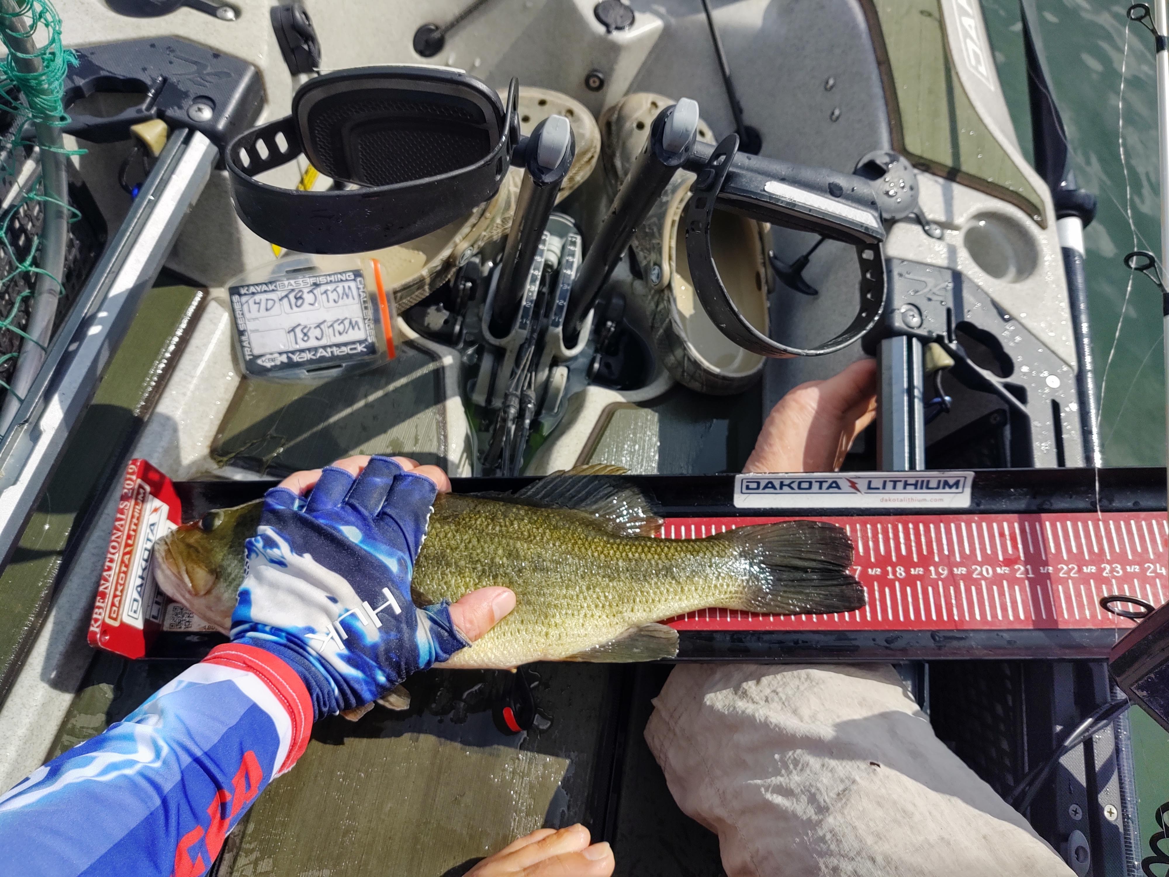 The wind was starting to pick up and I needed a change. With just under three hours left, I made the run into the beach, loaded the kayak on my cart, and ran across into the bay. I got to the launch and all I could see were waves! The bay was worse than the main lake. But I had made the decision to move so there was no going back now. I shoved off and battled the waves getting to my prime spot. By the time I pulled up I was soaked. I could see a kayak nearby and just hoped he hadn’t beat up this area too bad. I made one pass around and finally on the far side I got the bite I expected. A 13.50-inch largemouth and the skunk was off. It was 12:30 and I was on the board.
