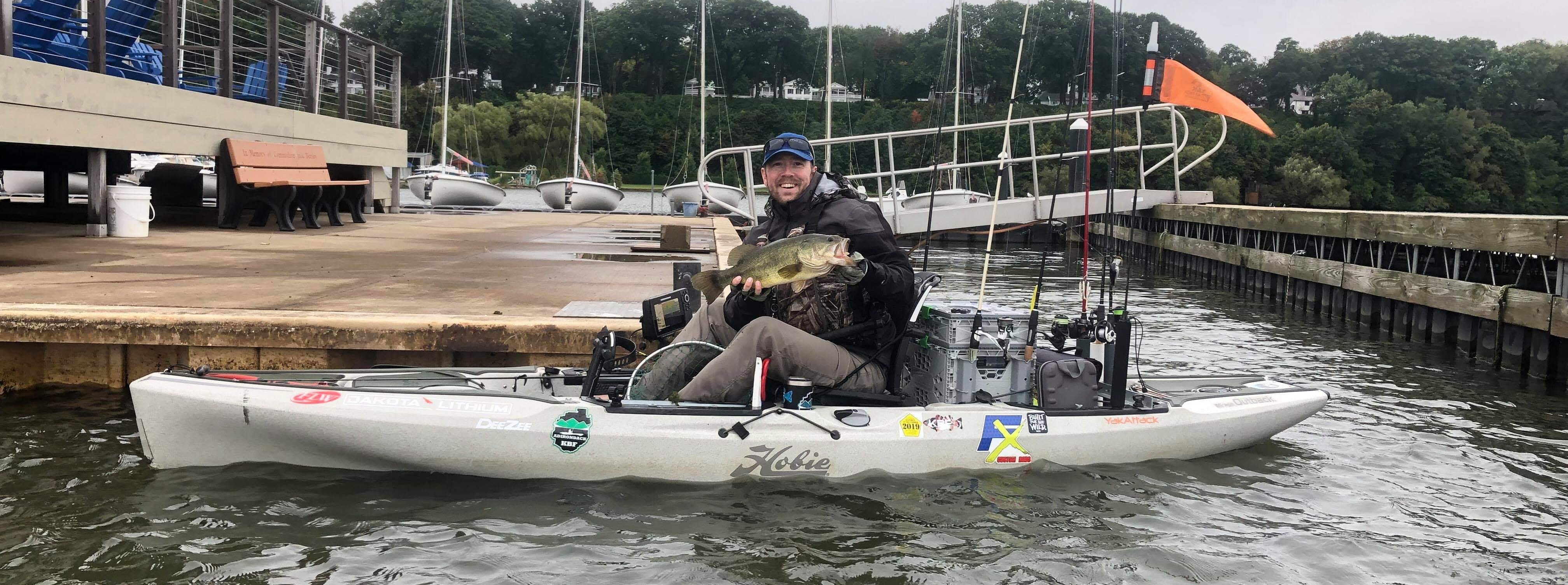I knew only having one pattern was no way to approach a tournament. I needed a plan B and hopefully even a plan C. I felt a deeper pattern would be good to establish so I started targeting the submerged weeds in 10-12 feet of water. I pitched a jig around, worked a chatterbait, swimbait, a big worm, a shakeyhead, but I couldn’t find another bite. I was getting tired of fighting the wind and was about to leave when I saw another kayak angler a short distance away. I recognized the kayaker as Trish from my home club and quickly pedaled over and caught up with her. We ended up going all the way across the bay to prefish around a marina.