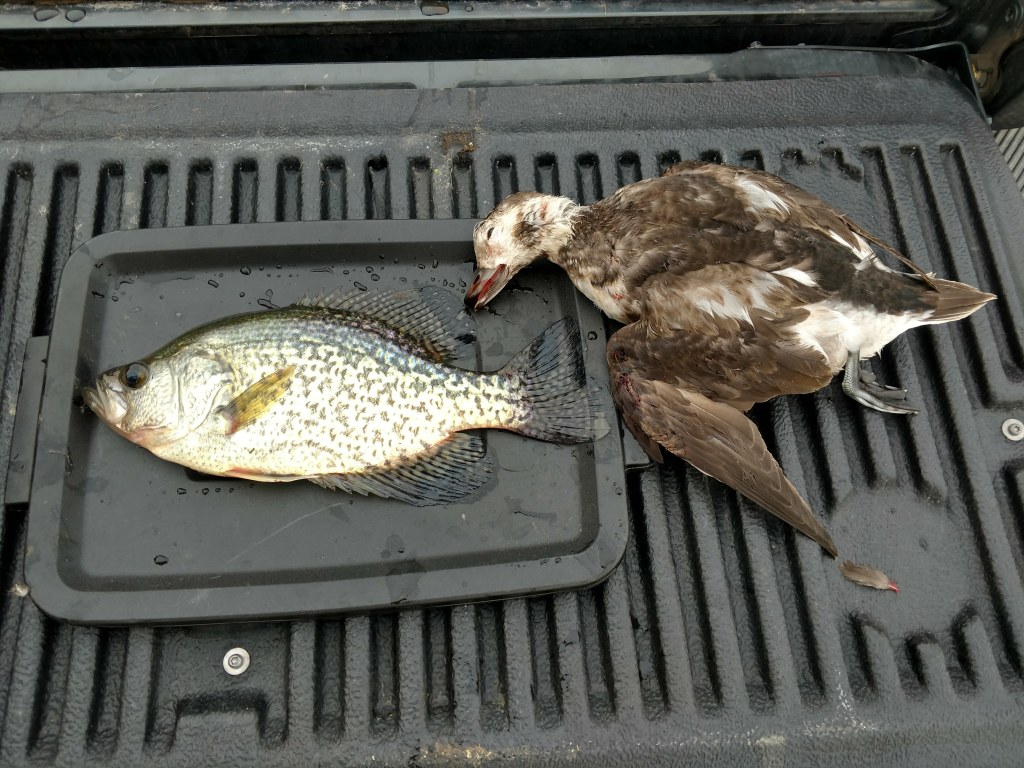 I made my way another half mile before crossing the river to return up the opposite bank. As I pedaled back upstream the fog was starting to lighten up a bit. Across the water I could make out the form of a flock of about 10 mergansers coming down the river toward me. Knowing this would likely be my last chance of the morning, I aimed my kayak diagonal across the river to cross in front of them. Holding the shotgun at the ready and just pedaling the kayak, I was able to quickly close the distance and got to about 30 yards before they decided they didn’t like the look of my boat moving fast against the current. I picked my first target and she dropped to the water. My second target was luckier and those pellets just flew into nothingness. The one I hit however was not done. She was crippled but was still able to swim and dive to try to escape. Again, using my pedals, I quickly made my way after the bird and was able to run it down and finish it off while pedaling my kayak the entire time.