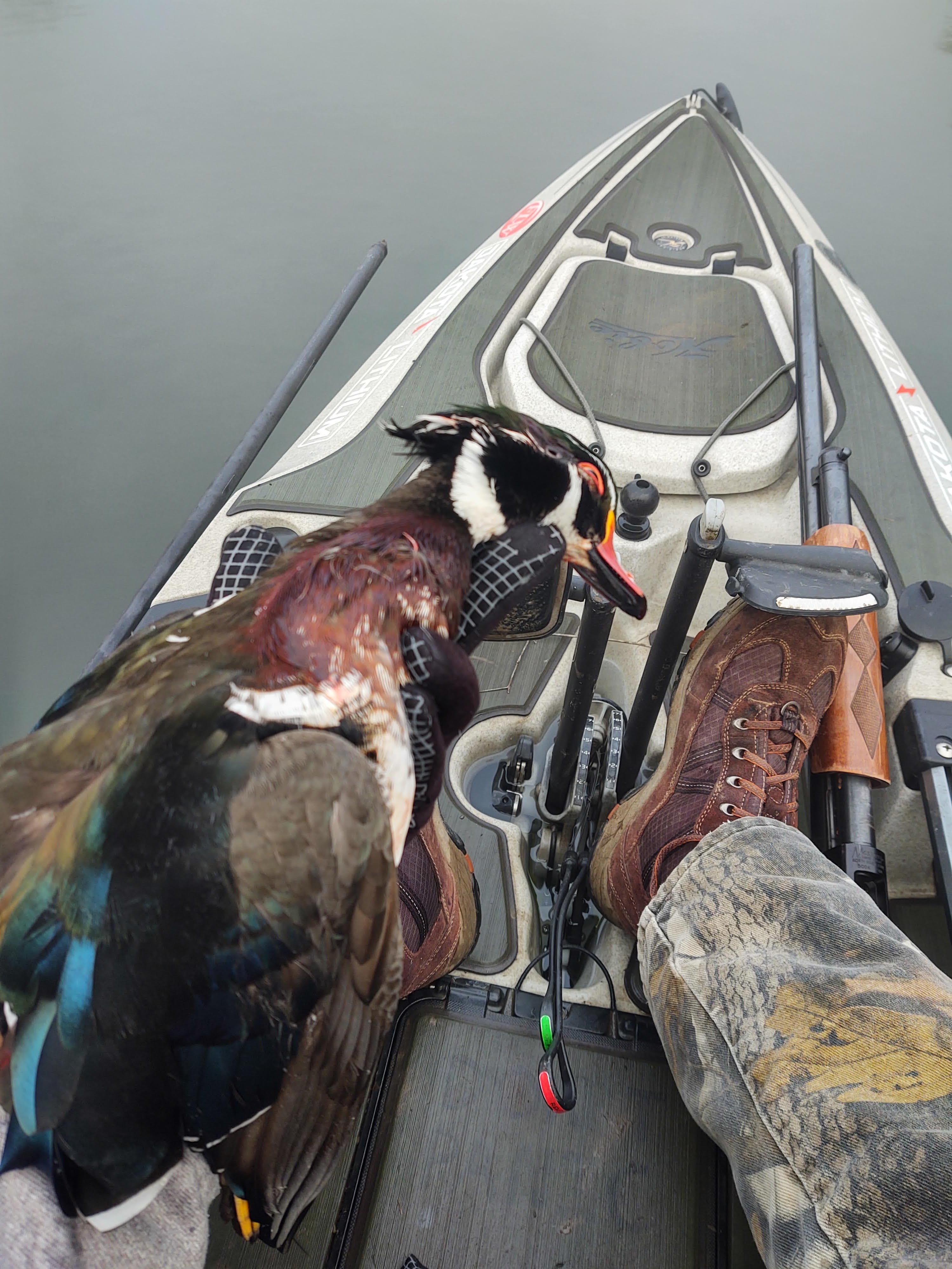 A quarter mile down the river, I started hearing some ducks up ahead. I took my hand off the rudder and got into a more ready position. I kept pedaling very slowly just maintaining course. Out of the fog ahead two wood ducks appears swimming up the river toward me. As they got closer, they saw the kayak, turned toward the middle of the river and took off. As they lifted off the water, I pulled the trigger and dropped a beautiful drake. The second shot did not find it’s mark and the other woodie disappeared into the mist.