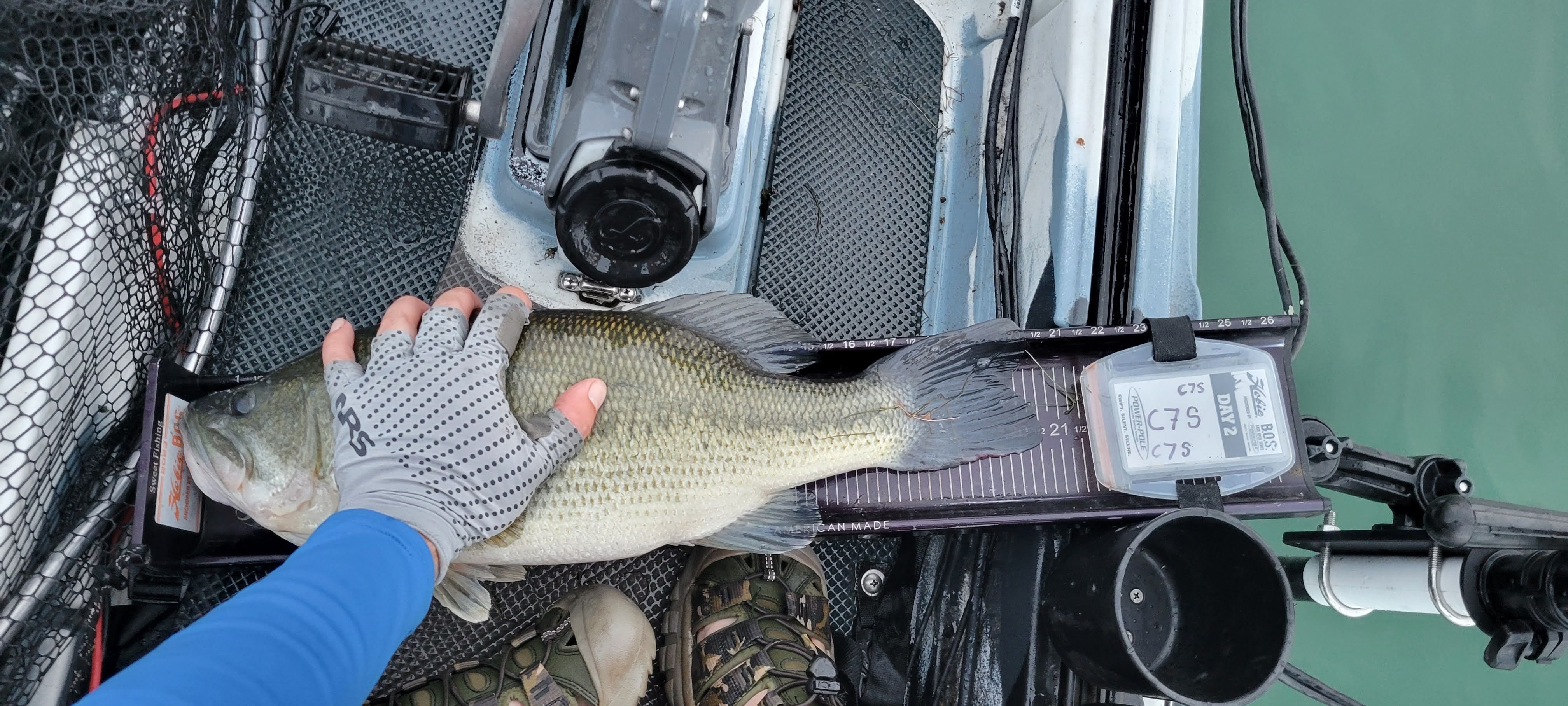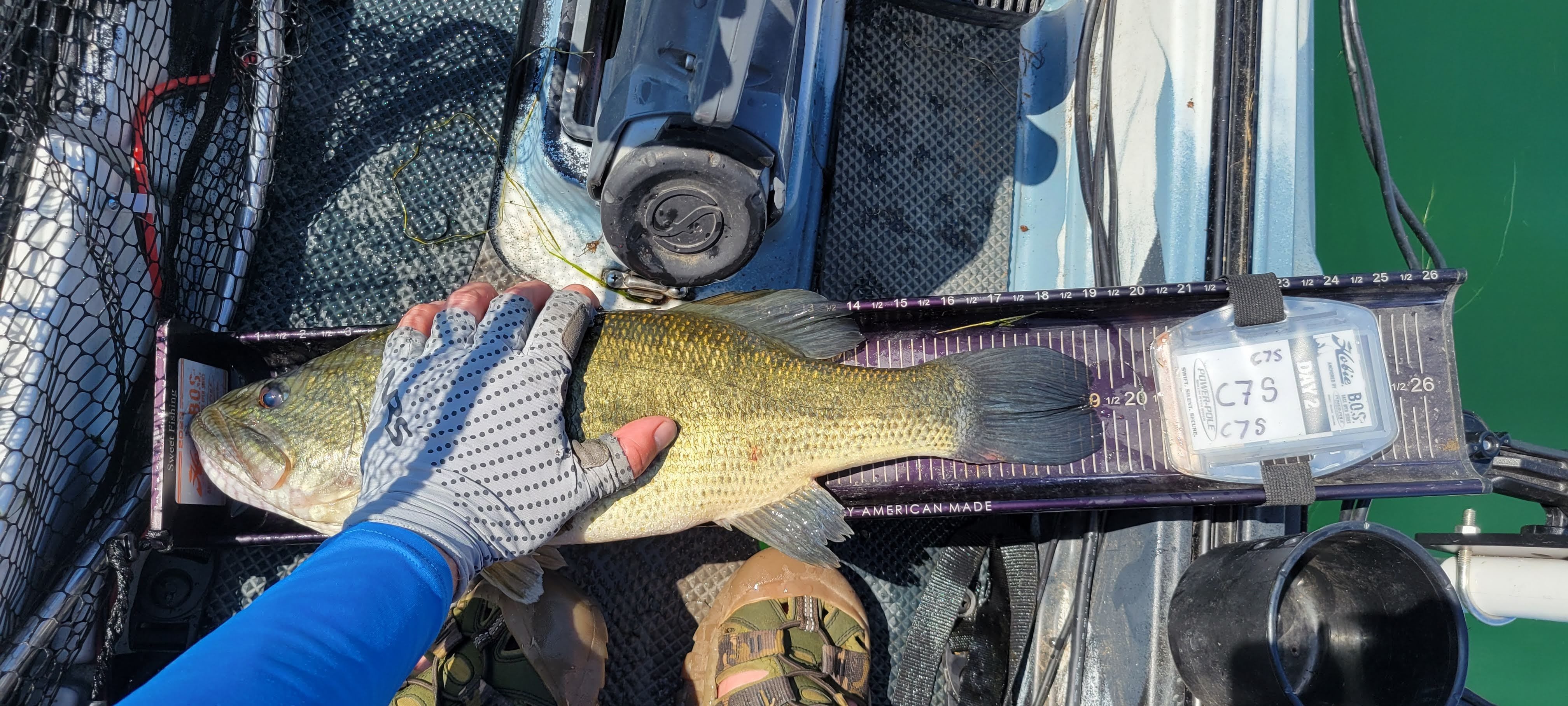I started that drift just inside of my previous drift. As I floated in line with my first two fish, I hooked into something big! She pulled down deep and wasn’t coming up to jump. I thought for sure it must be a drum, big pickerel, or even a rare catfish. As my leader got close she swam out from under the kayak and revealed herself to be a big ol fat largemouth. I scooped her up and it was my first cull! She went 19.25” and gave me an extra 1.5 inches. I was now at 92” for the day and moved myself up to 7th.